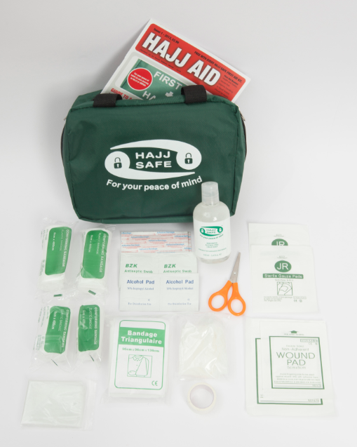 Hajj Safe a développé la toute première trousse de premiers secours Hajj & Umrah + Trousse de secours Hajj. Elle a été conçue spécialement pour les pèlerins pour le Hajj ou la Omra. Elle a été conçue à la lumière des consultations avec les médecins, les pharmaciens et les personnes qui ont été au Hajj et la Omra. Ce Kit de premiers secours Hajj a été conçu pour accueillir le contenu des premiers soins tels que les pansements et plâtres encore assez grands pour contenir des médicaments sur ordonnance et les médicaments courants telles que des analgésiques, crème antiseptique, crème au frottement de muscle,
